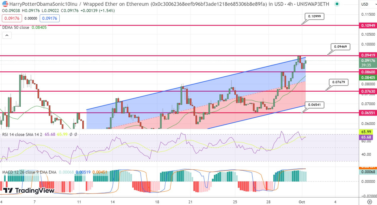 From a technical vantage point, the pivotal price for this coin is marked at 0.07582. HarryPotterObamaSonic10Inu (BSC) currently faces immediate resistance at 0.10965. This is trailed by resistances at 0.12839 and 0.17967.